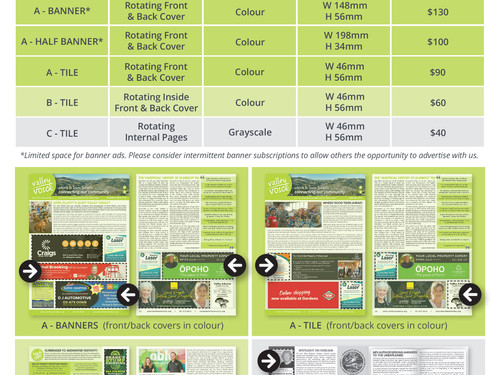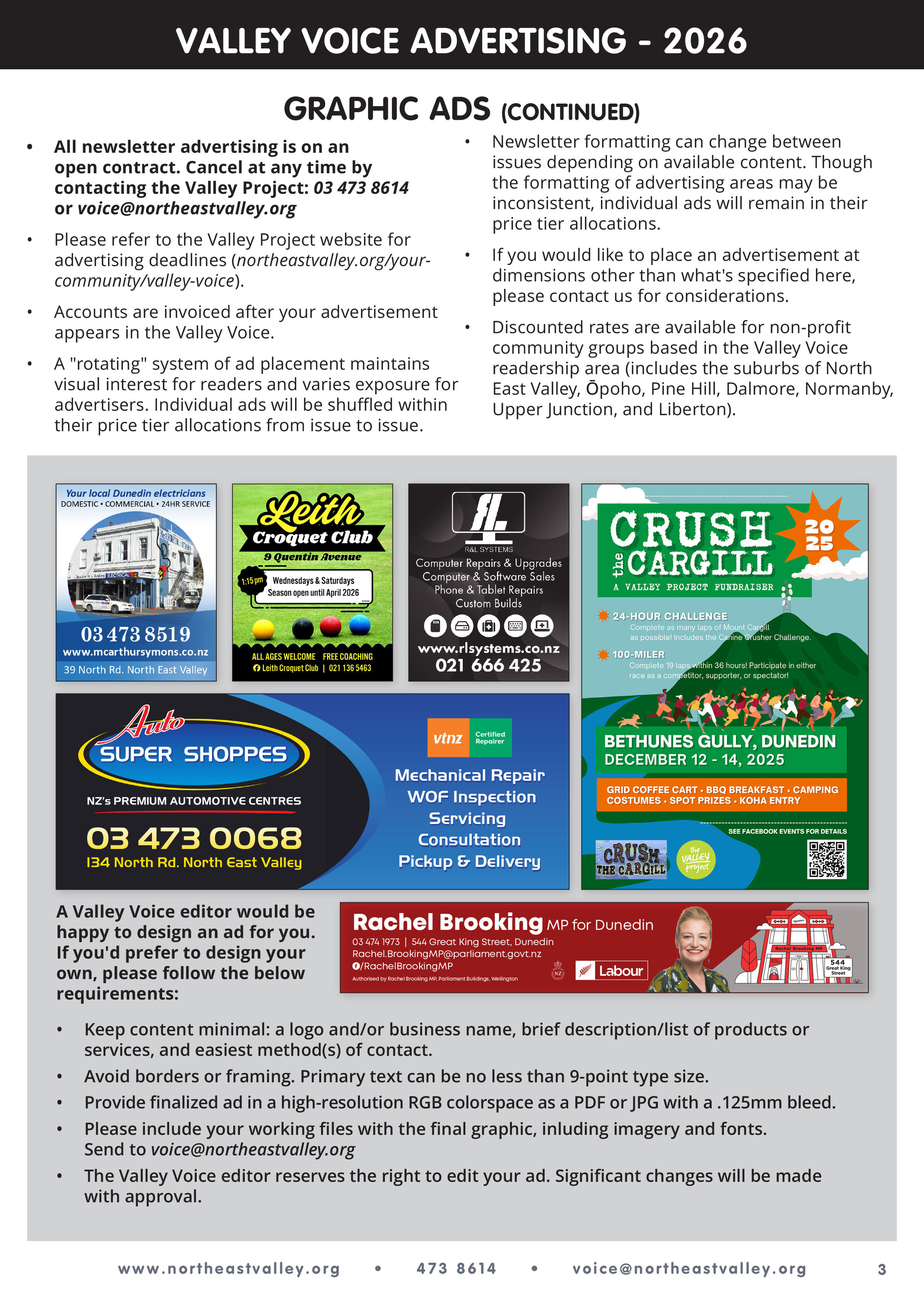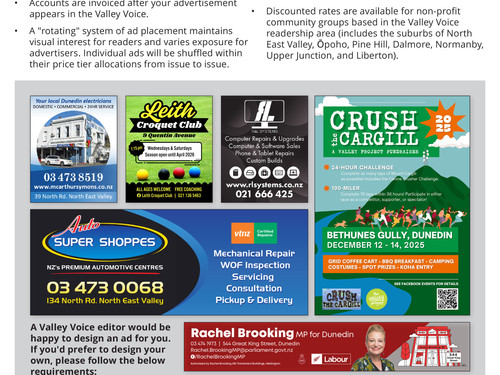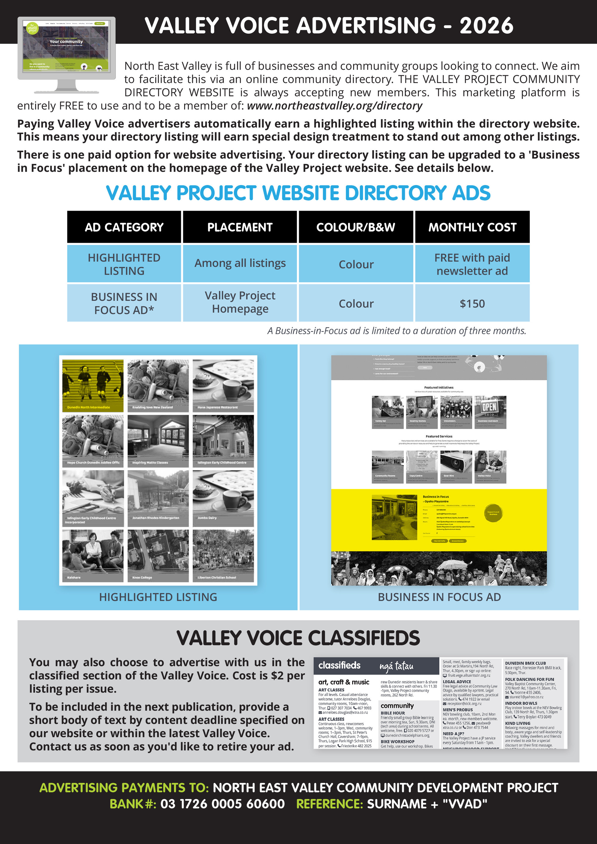 The Valley Voice is a free community newsletter delivered to 3900 mailboxes in the north Dunedin suburbs.