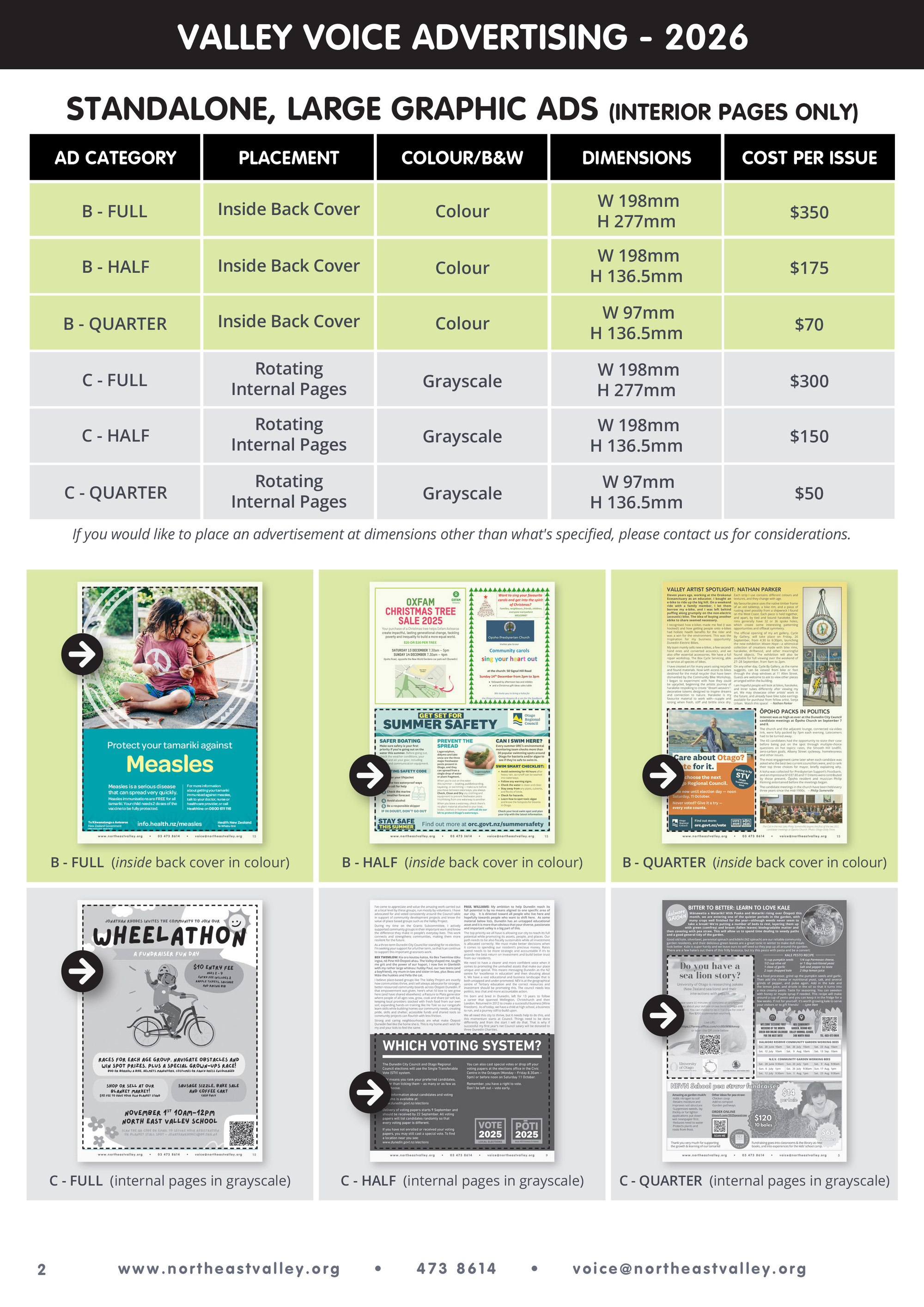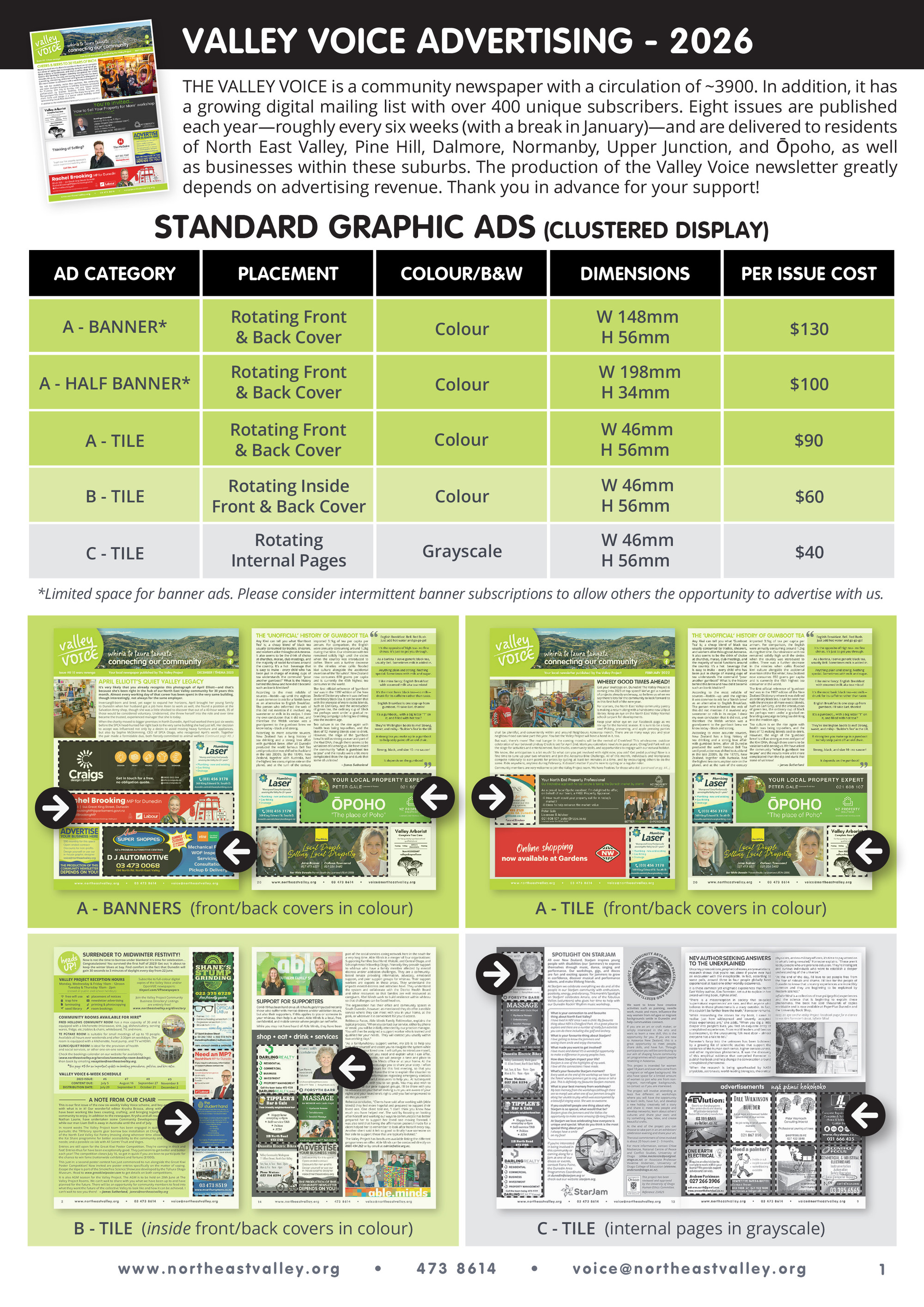 Contact our Valley Voice Editor about advertising in the Valley Voice: voice@northeastvalley.org or download the information sheet here.