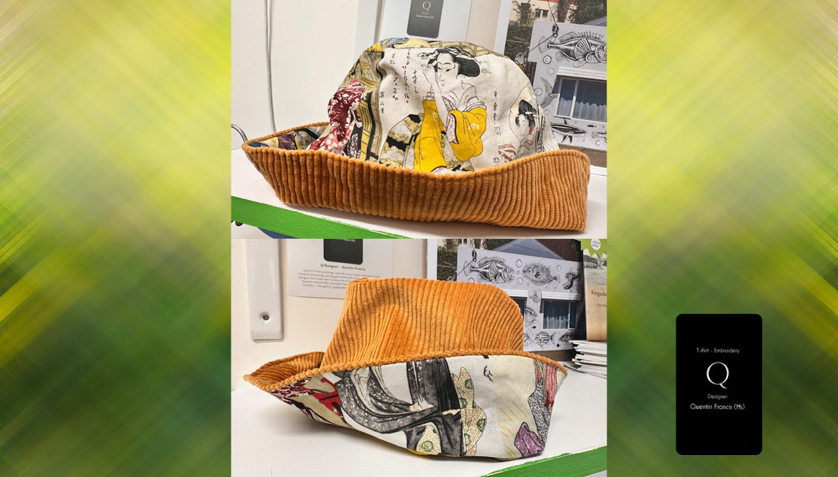 Quentin Francis brings new life to pre-loved clothing through creative upcycling, pairing garments with striking digital embroidery designs that make each piece one-of-a-kind. Alongside her apparel, Quentin handcrafts reversible hats that balance both style and function – thoughtful, sustainable fashion with a unique edge.